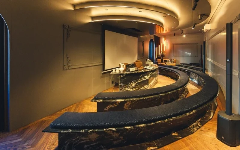 Espacio ESs, Interiores. En este proyecto de Sandra Antón, bajo el nombre Berlin Calling, la piedra original Naturamia® de Levantina Group tiene una presencia excepcional, tanto en el mobiliario –estantes, bancadas y mesas de diferentes estilos– como en el revestimiento de las paredes. La hipnótica cuarcita Belvedere y el solemne mármol Negro Marquina asumen el protagonismo del salón auditorio y lo recubren con la elegante sobriedad de los colores oscuros característicos de estas piedras originales que provocan “el efecto Wow” con su imponente presencia, que te enamora y envuelve.