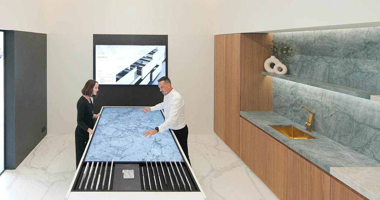 With this new flagship, the Levantina Group is committed to transforming the shopping experience through digital innovation to make it memorable. Natural and sintered stone cladding is a central feature in any remodelling or new construction project, and samples, due to their size and usability, don't always give a good idea of the end result. Through this experience, customers can compare the different colours of the worktop collections digitally and in their actual size to see which one is right for them.