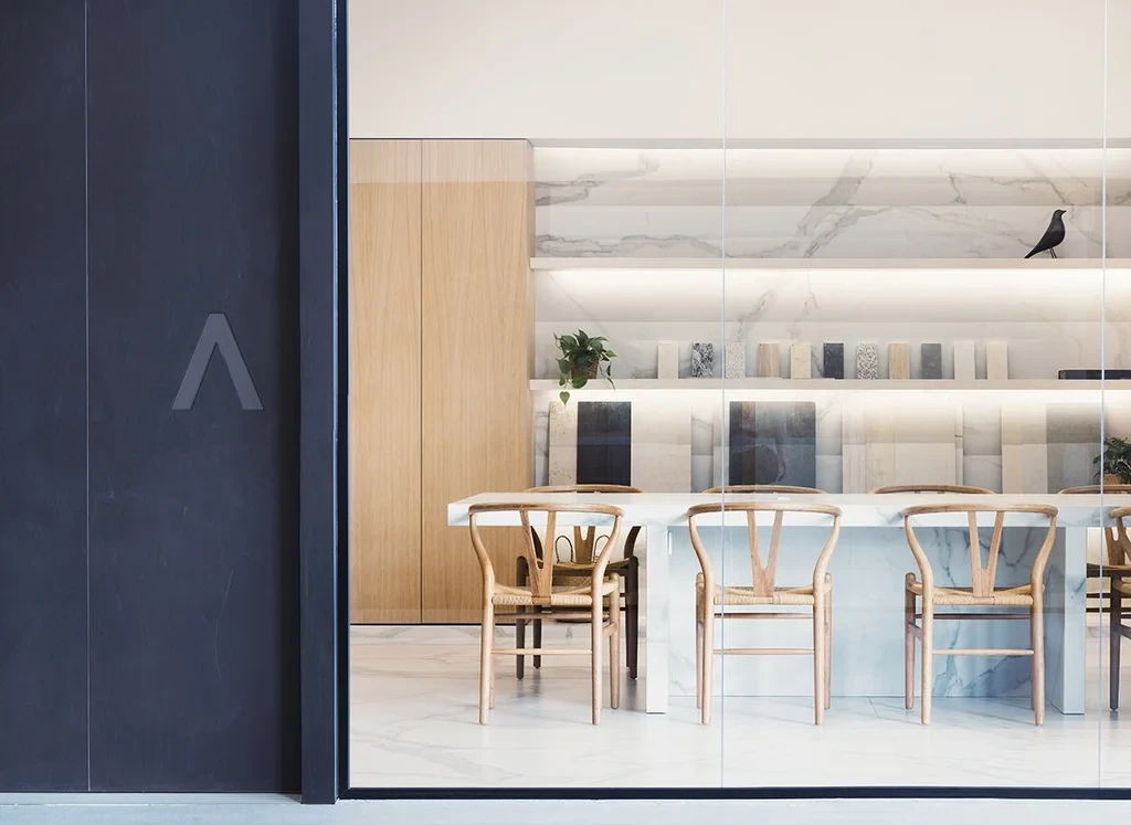 The showroom is divided into two distinct areas: Kitchen & Bath and PRO. In the area dedicated to kitchens, a “Creative Kitchen” has been installed, an innovative digital tool that is a pioneer in the sector and allows users to visually change the finish of a worktop based on the sample selected. This technology provides an intuitive, full-size simulation of the material of the natural stone or sintered stone selected, helping users to visualise the application of the material selected. In addition to this experience, all the information on the material regarding its origin, data sheet and sample applications in real projects is presented.
