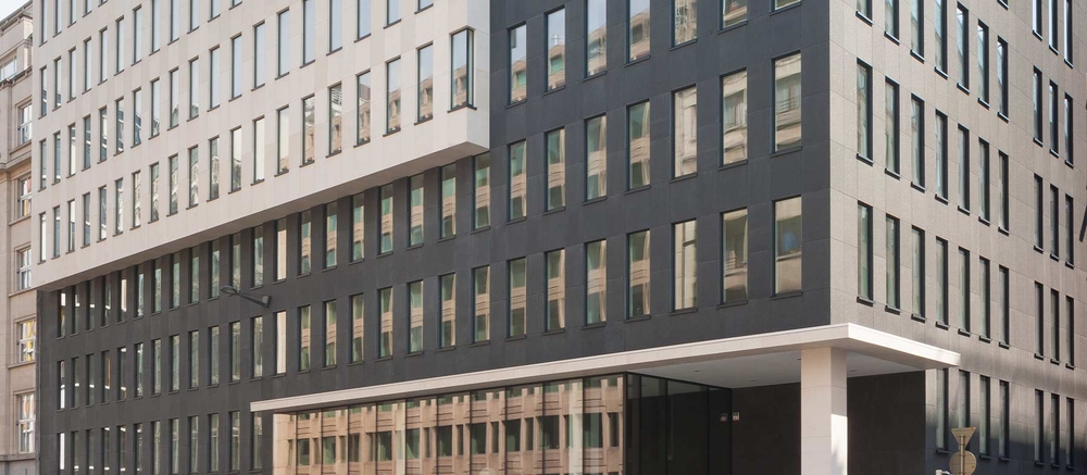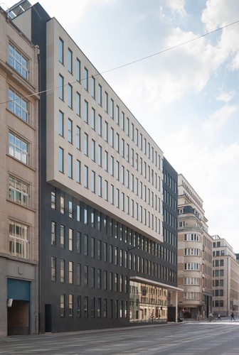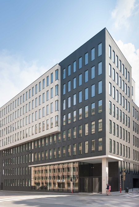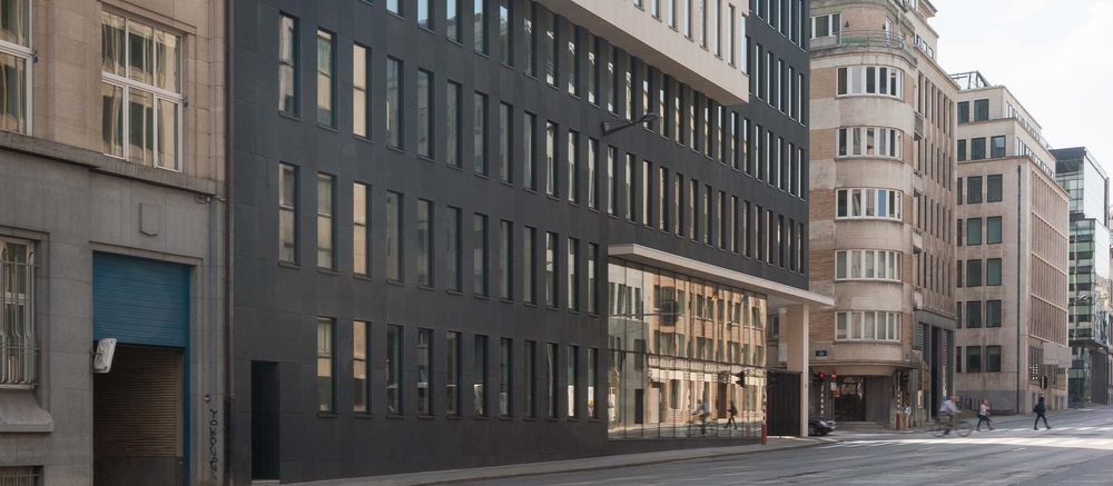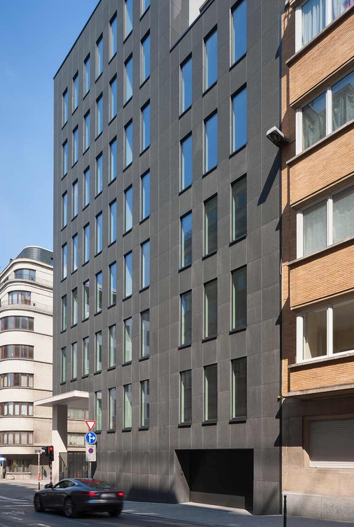 Calm and rational: these two words describe to perfection the beautiful architecture that is on display at this office building located in rue Beillard 65 in Brussels. The property was renovated in 2015, marking quite the architectural milestone in the city. The beauty of the material that covers much of its façade, Levantina's Zimbabwe Black granite, can take some credit for this architectural success: its deep black colour with bright sparkles has proven to be the perfect choice, by incorporating the grace of Original Stone into a building as discreet as it is elegant.