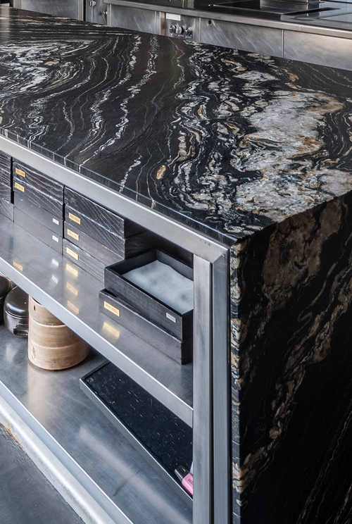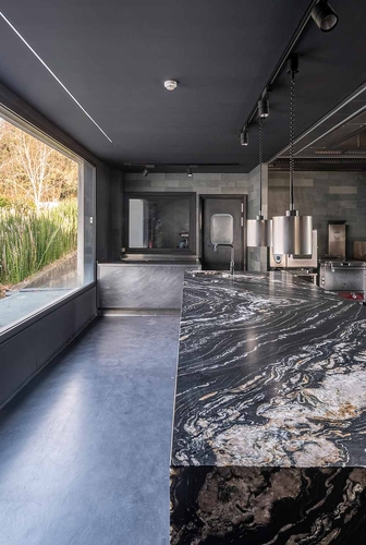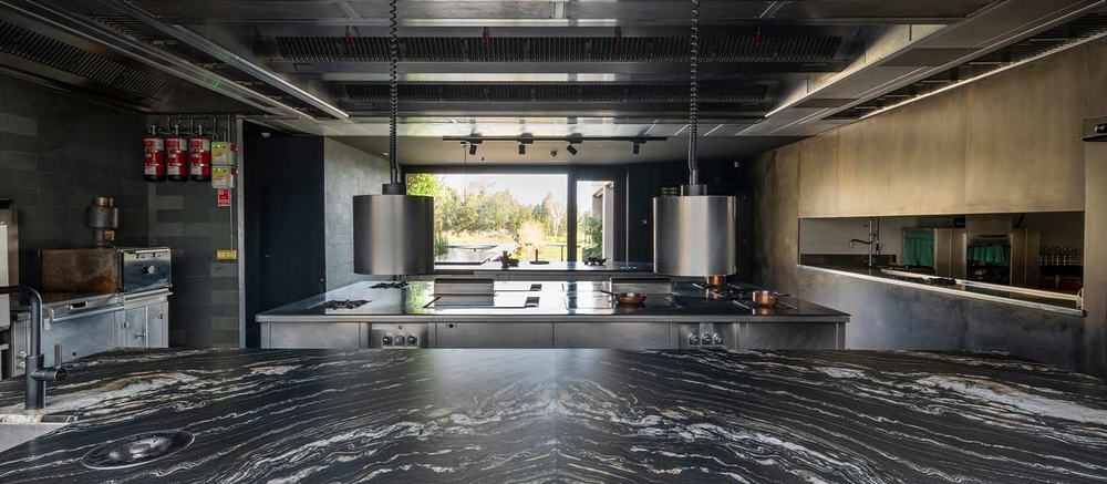 Pepe Vieira's “Farthest cuisine of the world”, with two Michelin stars and one green Michelin star and Naturamia's spectacular Belvedere quartzite, with its sumptuous black background that gives way to the marbled amber, becomes the perfect ally for this extraordinary culinary experience. The evocative beauty of this ancient original stone brings an air of distinction in this inspiring creative space, to realign it and bring it closer to a sensory and aesthetic luxury, giving it its own identity through its natural exclusivity.