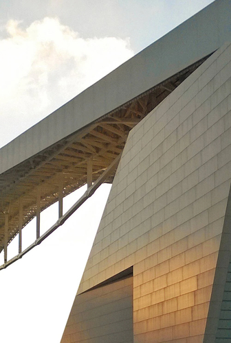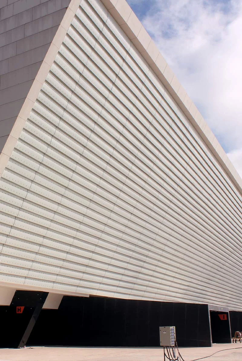 Basic Neu reviste con elegancia la fachada del Estado Arena Corinthians de São Paulo (Brasil), un edificio tan equilibrado como minimalista. La piedra sinterizada de Levantina Group destaca por su color blanco puro sin distracciones, que logra que una impresionante arquitectura. Las líneas paralelas que conforman la cuadrícula creada por el revestimiento generan un pentagrama móvil sobre las fachadas, viéndose cortadas de vez en cuando por diagonales que rompen la monotonía.