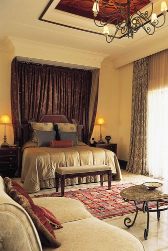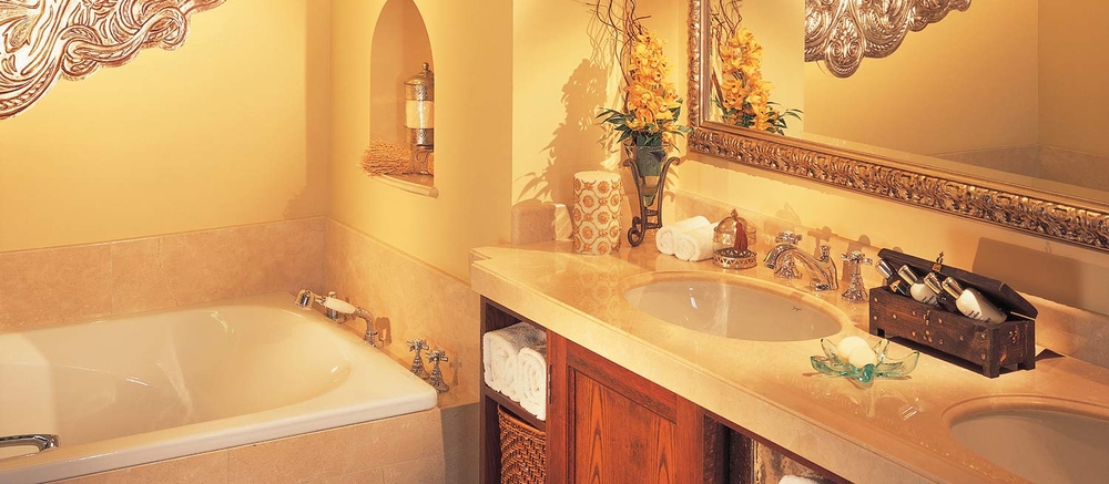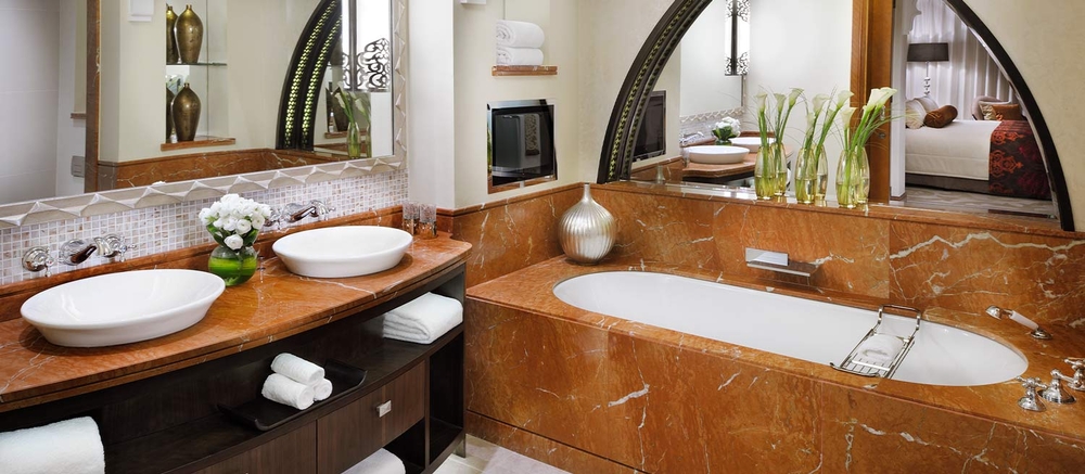 El proyecto hotelero incluye una construcción a imagen y semejanza de un palacio, además de un área residencial y un entramado de patios, canales, plazas y jardines con una ornamentación muy exótica. Una decoración oriental contemporánea y de lujo donde Crema Marfil Coto® transforma aplacados y solados de interior en bellas superficies que proyectan una gran luminosidad por su acabado pulido. La elegancia suprema de Marrón Emperador, con sus veteados claros, y la personalidad de Rojo Alicante, lucen en toda su magnitud en los baños de las habitaciones, auténticos espacios de culto al agua y a la relajación.