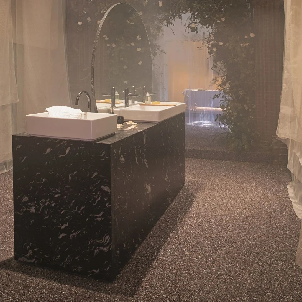A pedra original Naturamia Cheyenne Xtreme, com sua superfície polida, transforma os lavatórios, o grande espelho e a porta em belas esculturas. O acabamento vintage apresentado nesse granito preserva o tom natural e as qualidades originais, permitindo que ele atue como o fio condutor entre a decadência da capela e a modernidade do projeto do arquiteto. A peça selecionada por Carulla, feita com a pedra original do Grupo Levantina, combina a funcionalidade, a sustentabilidade e o aspecto estético da visão do designer, bem como a presença imersiva da pedra original natural Cheyenne Xtreme.